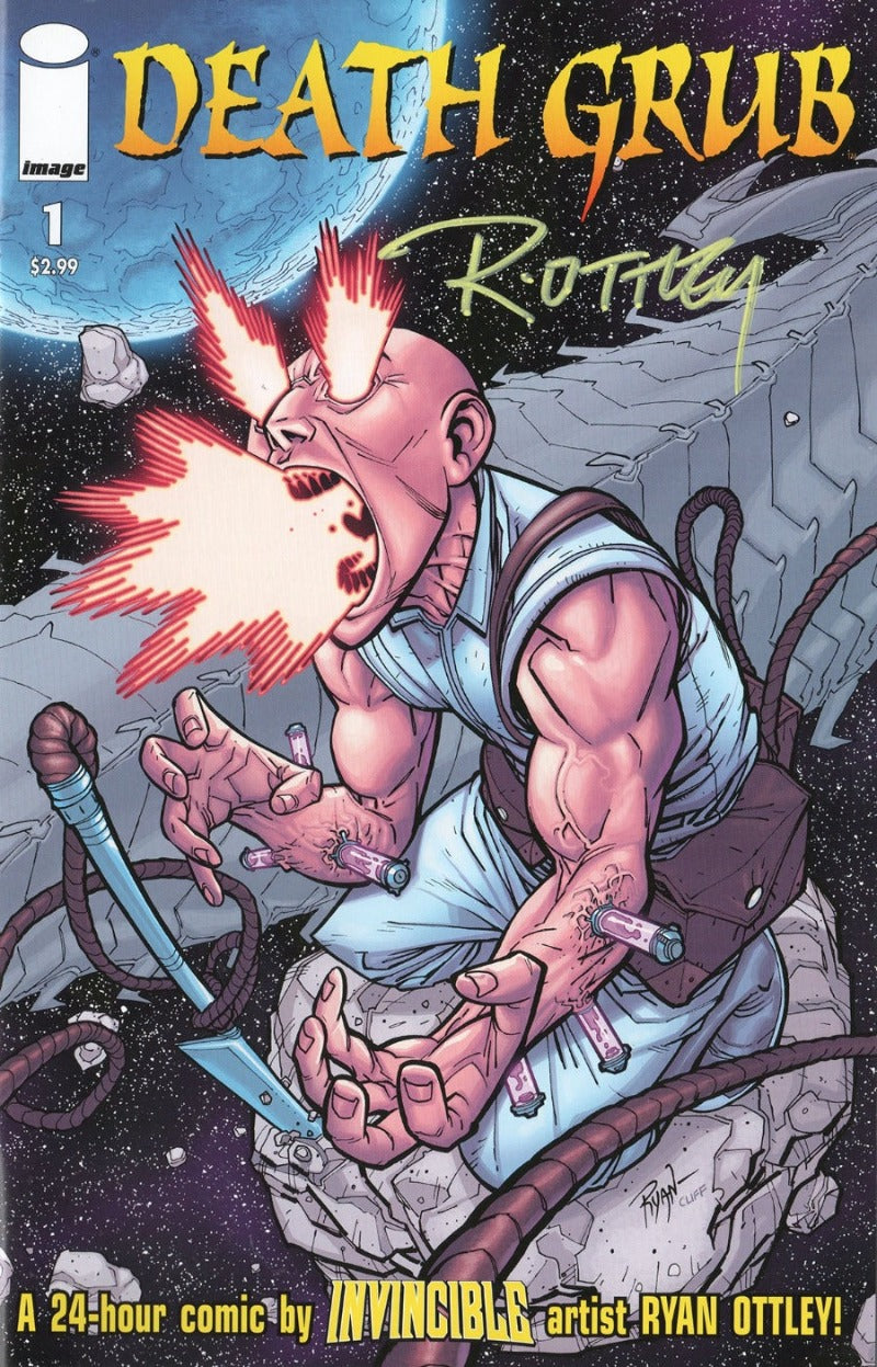 From the mind of Ryan Ottley comes DEATH GRUB, a comic that he wrote, pencilled, inked, and lettered, all in 24 hours. 24 hour comics day is a day where one attempts to do an entire comic in one whole day, the madness that ensues after sleep deprivation is over-the-top insanity. A mad rush to the finish to come up with ideas, to keep the quality up even though rushing is the only option!